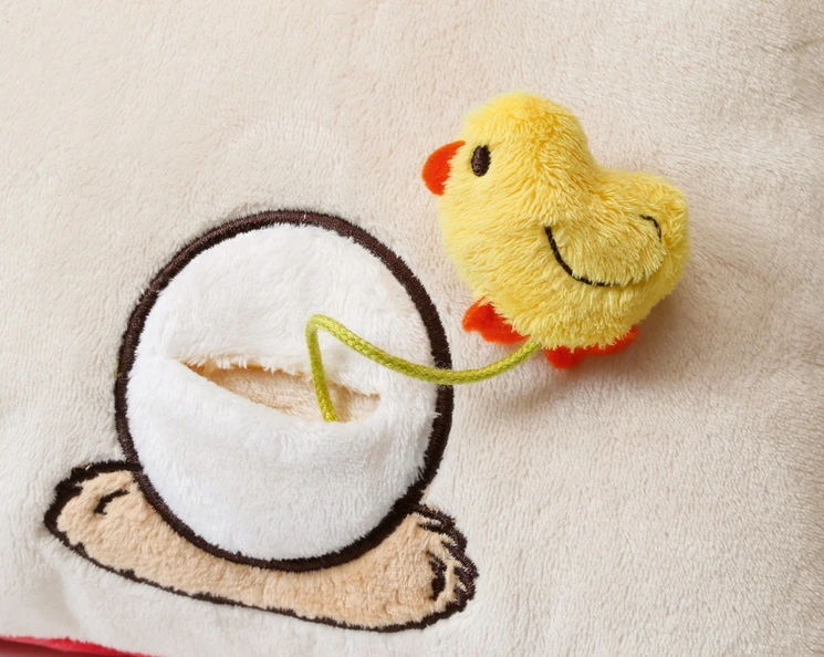 Das kleine Küken ist mittels einem Band im Kissen befestigt und kann wie abgebildet auch herausgenommen werden
